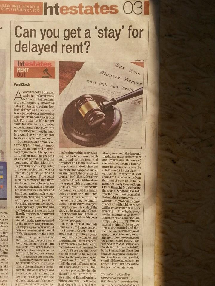 A word that often plagues real estate related transactions are injunctions, more colloquially known as “stays”. VIEW IN DETAIL Share this postFacebookTwitter About the author JusContractus Related postsIndia Losing its Domestic Arbitration! The Need for Legislative AmendmentJanuary 30, 2018The Arbitration Agreement – Keep It SimpleJanuary 19, 2017What’s the deal?March 19, 2016Radio InterviewsJanuary 9, 2016Why Intellectual Property is critical for startupsJanuary 9, 2016How India exploits millions of white-collar workersJanuary 9, 2016