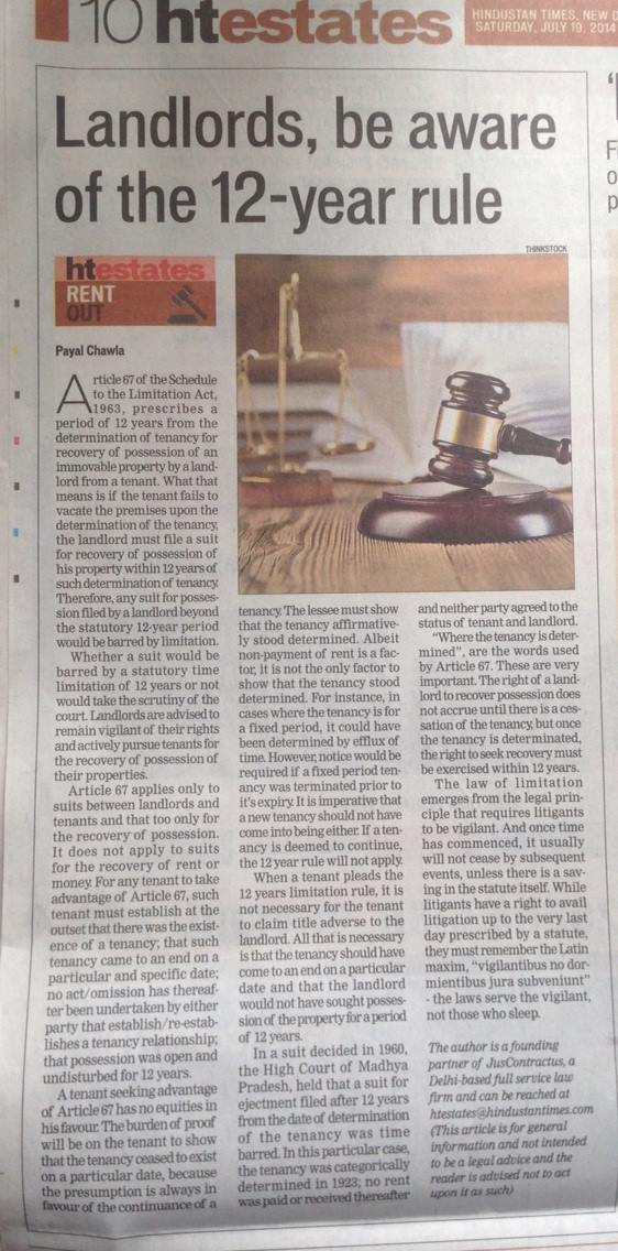 Article 67 of the Schedule to the Limitation Act, 1963, prescribes a period of 12 years from the determination of tenancy for recovery of possession of an immovable property by a landlord from a tenant. What that means is it the tenant fails to vacate the premises upon the determination of the tenancy, the landlord must file a suit for recovery of possession of such determination o tenancy. Therefore, any suit for possession filled by a landlord beyond the statutory 12-year period would be barred by limitation.