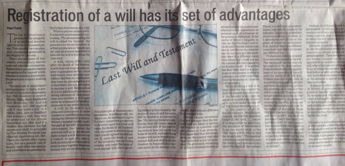 There are two types of succession, testamentary succession and intestate succession. VIEW IN DETAIL Share this postFacebookTwitter About the author JusContractus Related postsIndia Losing its Domestic Arbitration! The Need for Legislative AmendmentJanuary 30, 2018The Arbitration Agreement – Keep It SimpleJanuary 19, 2017What’s the deal?March 19, 2016Radio InterviewsJanuary 9, 2016Why Intellectual Property is critical for startupsJanuary 9, 2016How India exploits millions of white-collar workersJanuary 9, 2016
